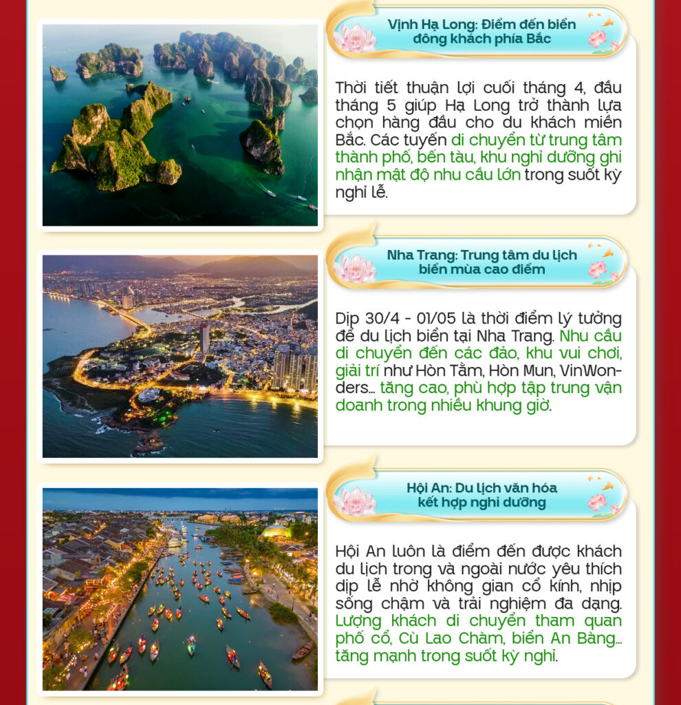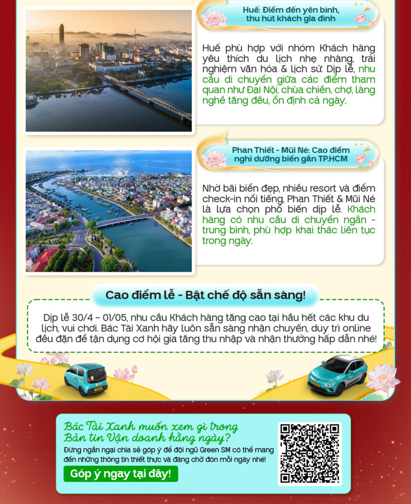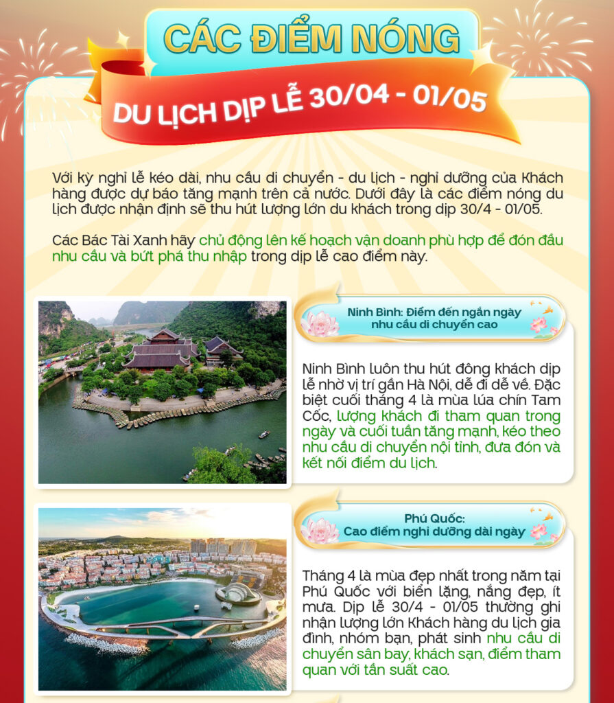 Với kỳ nghỉ lễ kéo dài, nhu cầu di chuyển – du lịch – nghỉ dưỡng của Khách hàng được dự báo tăng mạnh trên cả nước. Bác Tài Xanh hãy khám phá các địa điểm du lịch thu hút đông đảo du khách để chủ động lên kế hoạch vận doanh phù hợp, đón đầu nhu cầu và bứt phá thu nhập trong dịp lễ cao điểm này! Và Bác Tài Xanh lưu ý tuyệt đối không thực hiện các hành vi vi phạm gian lận, thu tiền ngoài ứng dụng để đảm bảo vận doanh hiệu quả và minh bạch nhé!