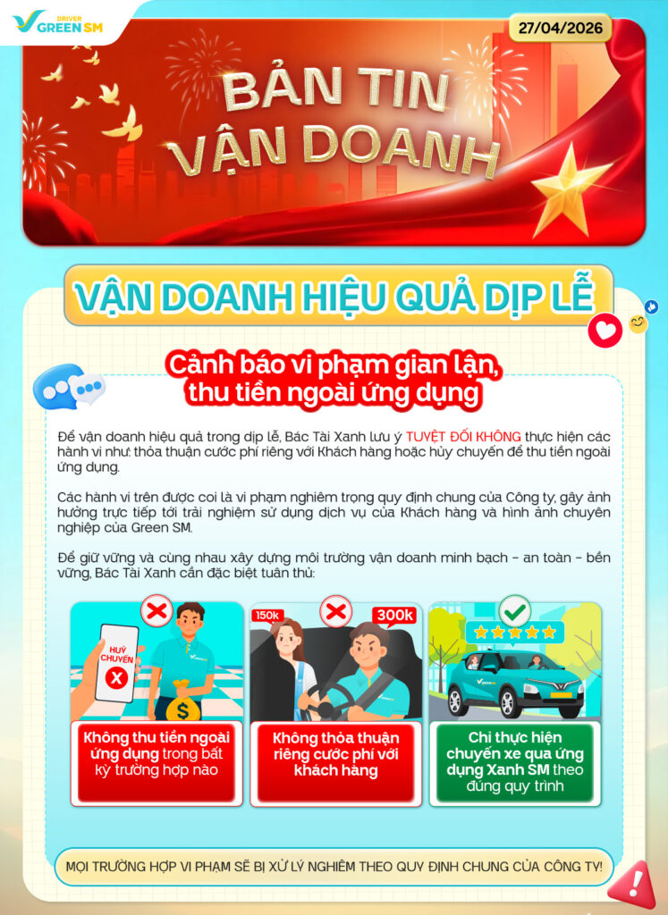 Bác Tài Xanh thân mến, 💙Dịp lễ 30/4 – 01/5 cận kề, nhu cầu di chuyển tăng cao mở ra cơ hội để Bác Tài Xanh bứt tốc vận doanh và gia tăng thu nhập. Hãy luôn giữ vững tác phong chuyên nghiệp, ứng xử chuẩn mực trong từng chuyến xe và tuyệt đối không […]