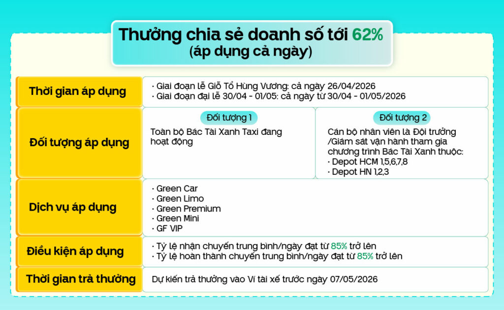 Bác Tài Xanh thân mến,🎉 Các dịp lễ lớn đã cận kề! Từ lễ Giỗ Tổ Hùng Vương tới Đại lễ 30/04 – 01/05, tất cả đang tới rất gần và nhu cầu Khách hàng sẽ tăng cao trong giai đoạn cao điểm này! Đây chính thời điểm vàng để Bác Tài Xanh mở app, […]