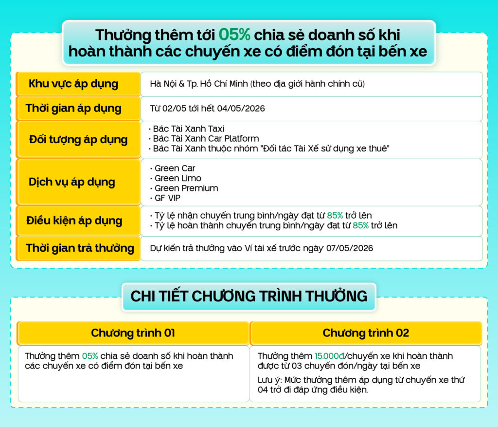 [Hà Nội & Tp. Hồ Chí Minh] Thưởng thêm tới 05% chia sẻ doanh số khi hoàn thành các chuyến xe có điểm đón tại bến xe