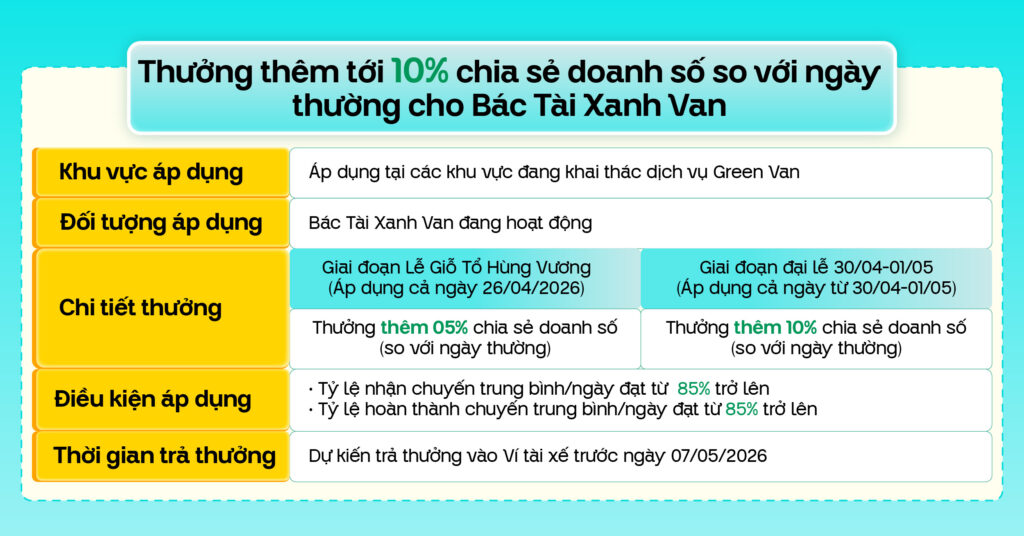 Thưởng thêm tới 10% chia sẻ doanh số so với ngày thường cho Bác Tài Xanh Van